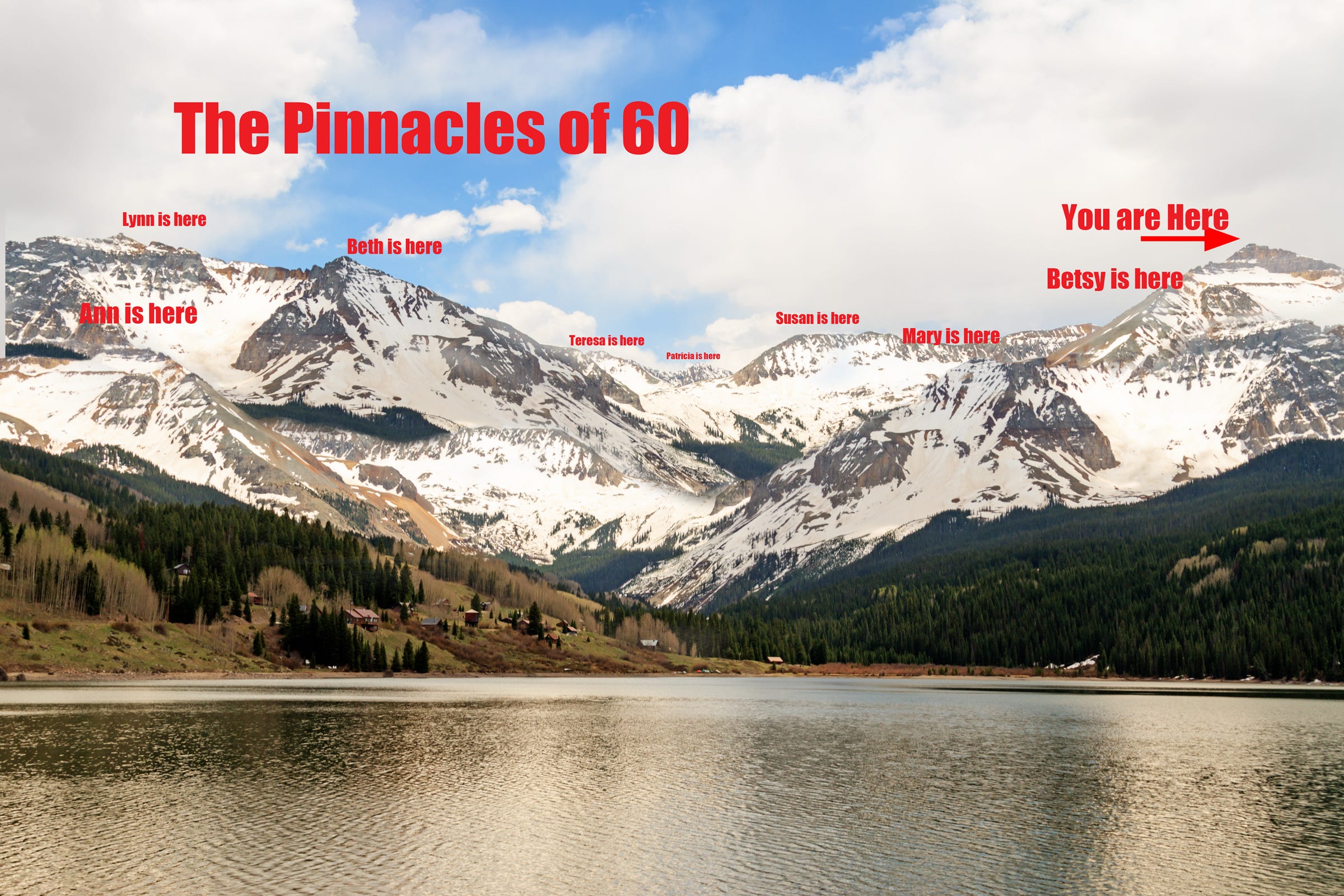 I am an 18-year-old girl perched on the pinnacle of 60. It is a clear view from up here. I can see so much with the clarity of height this point gives. Like climbing a tree in the forest to get one’s bearings. Sixty isn’t a wimpy little hill; it’s a peak… a mountaintop with snow but warmed with sun. The wind blows fresh and the view is fabulous.