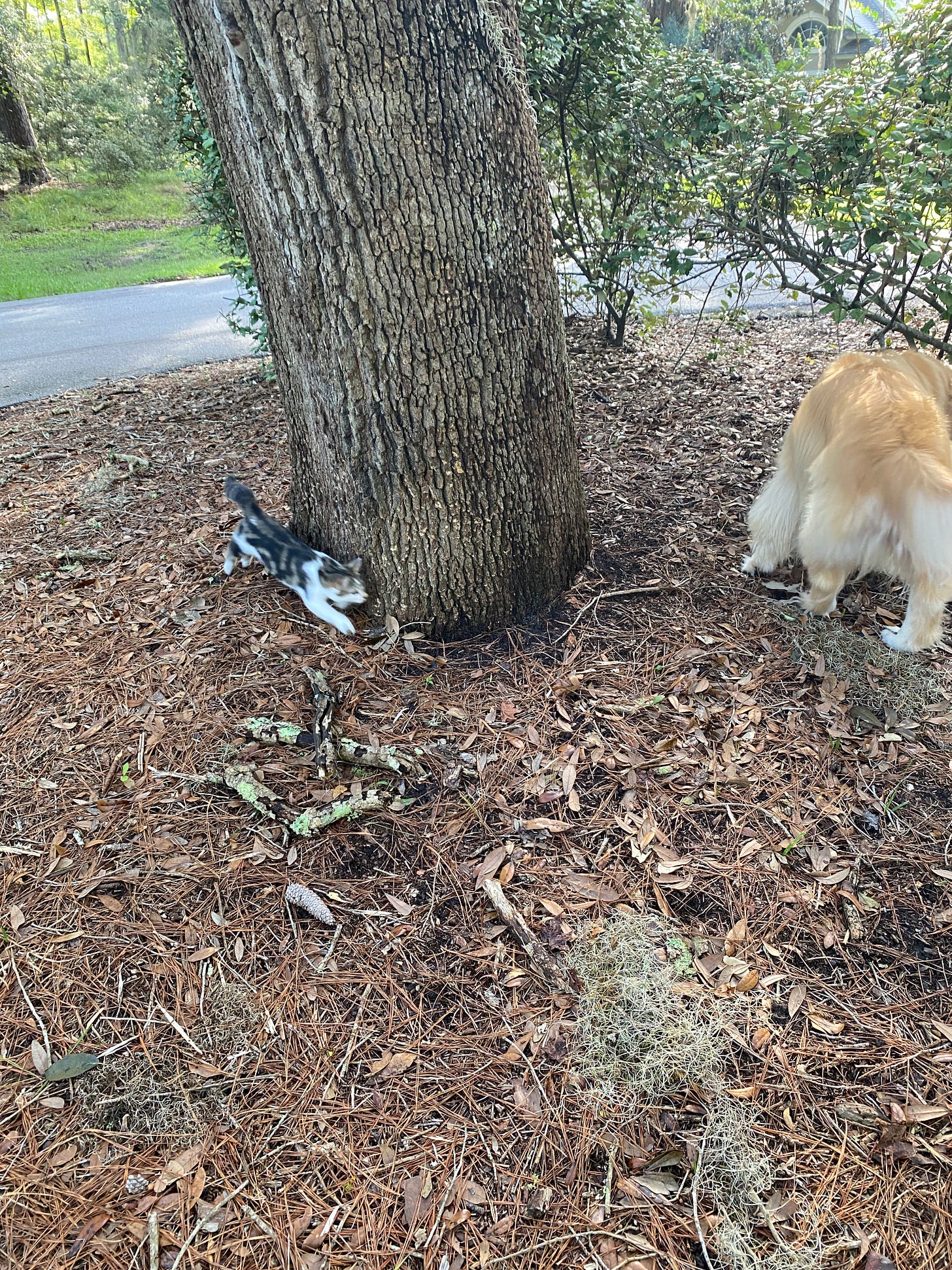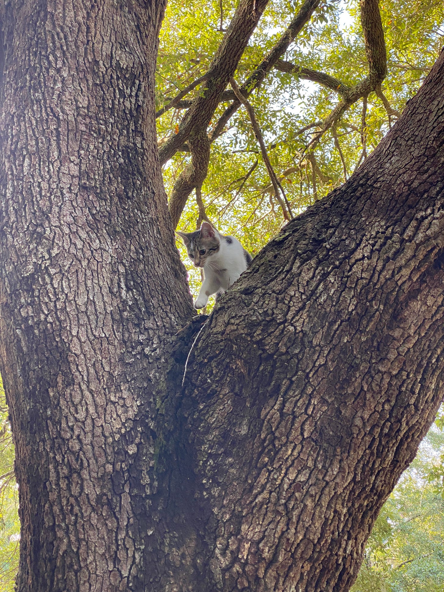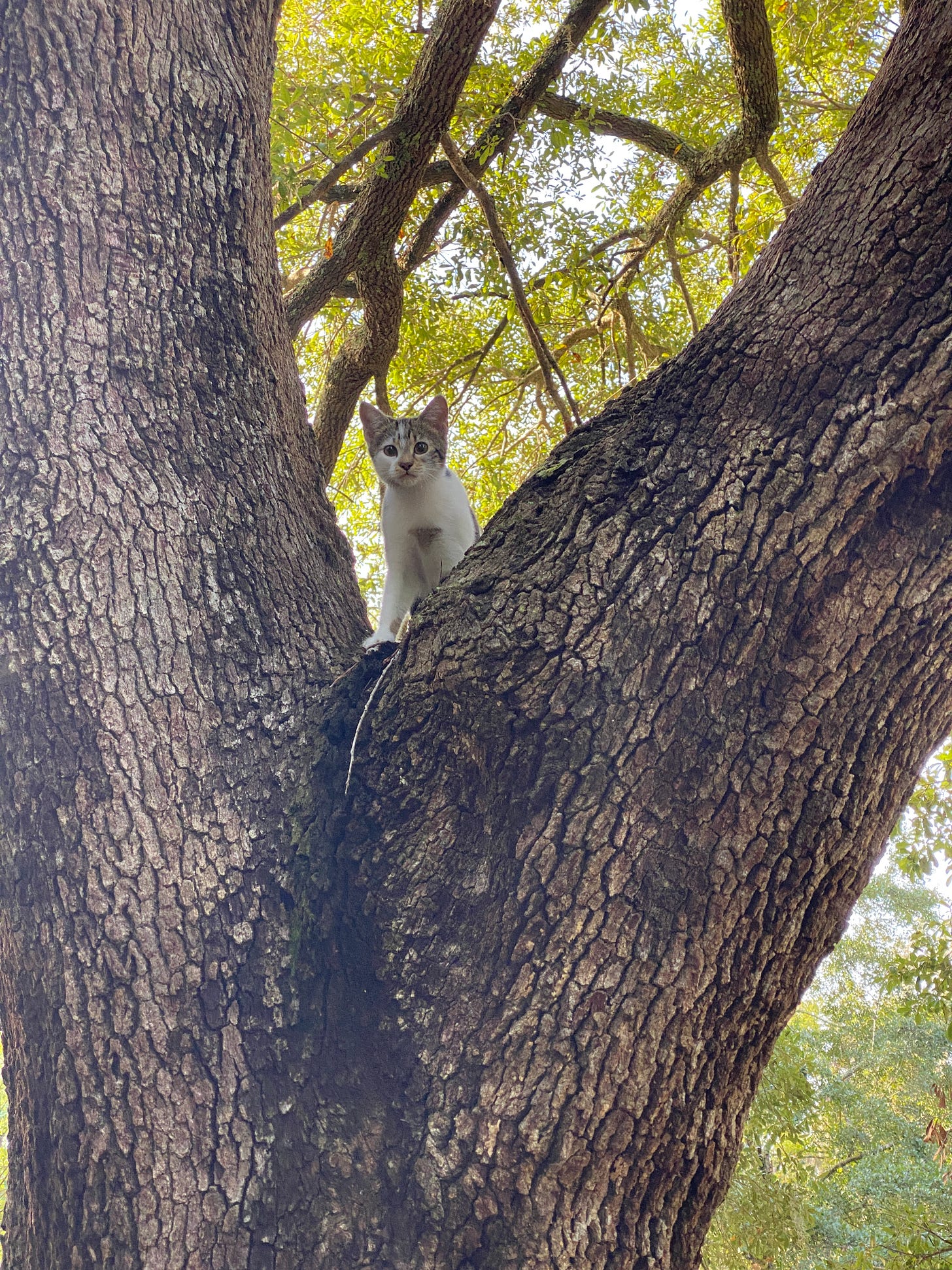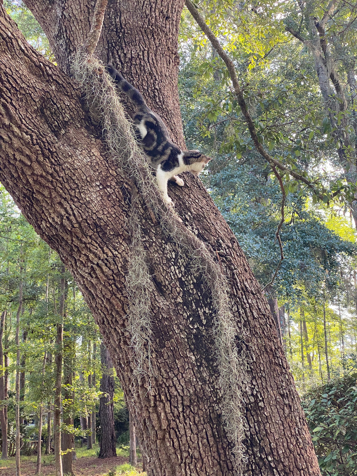 But there, at the quarter mile mark, looming in the center island at the heart of the cul-de-sac, is a magnificent live oak. It’s a perfect cat tree. The trunk has a nice V just right for perches and surveying one’s Queendom.
