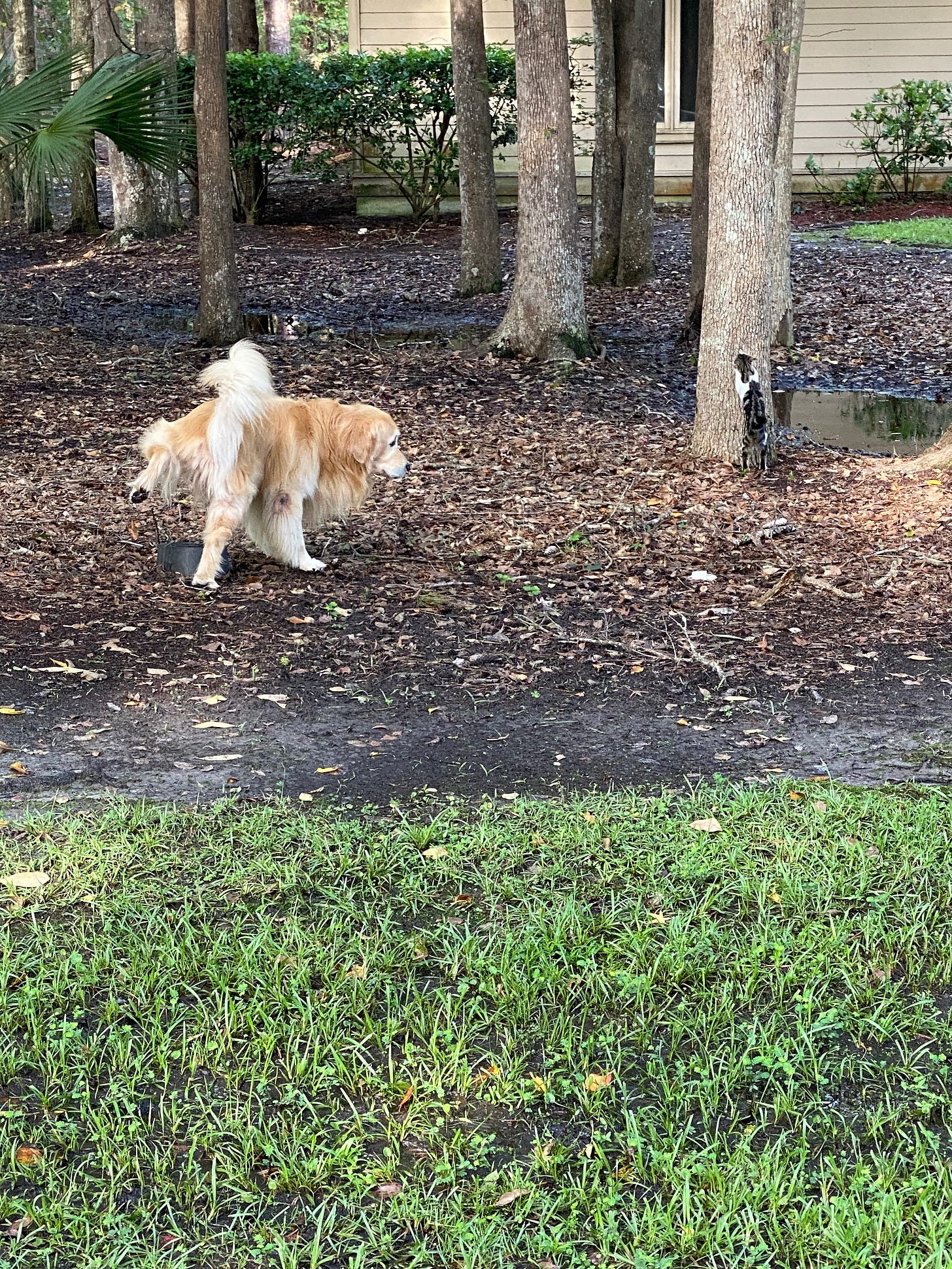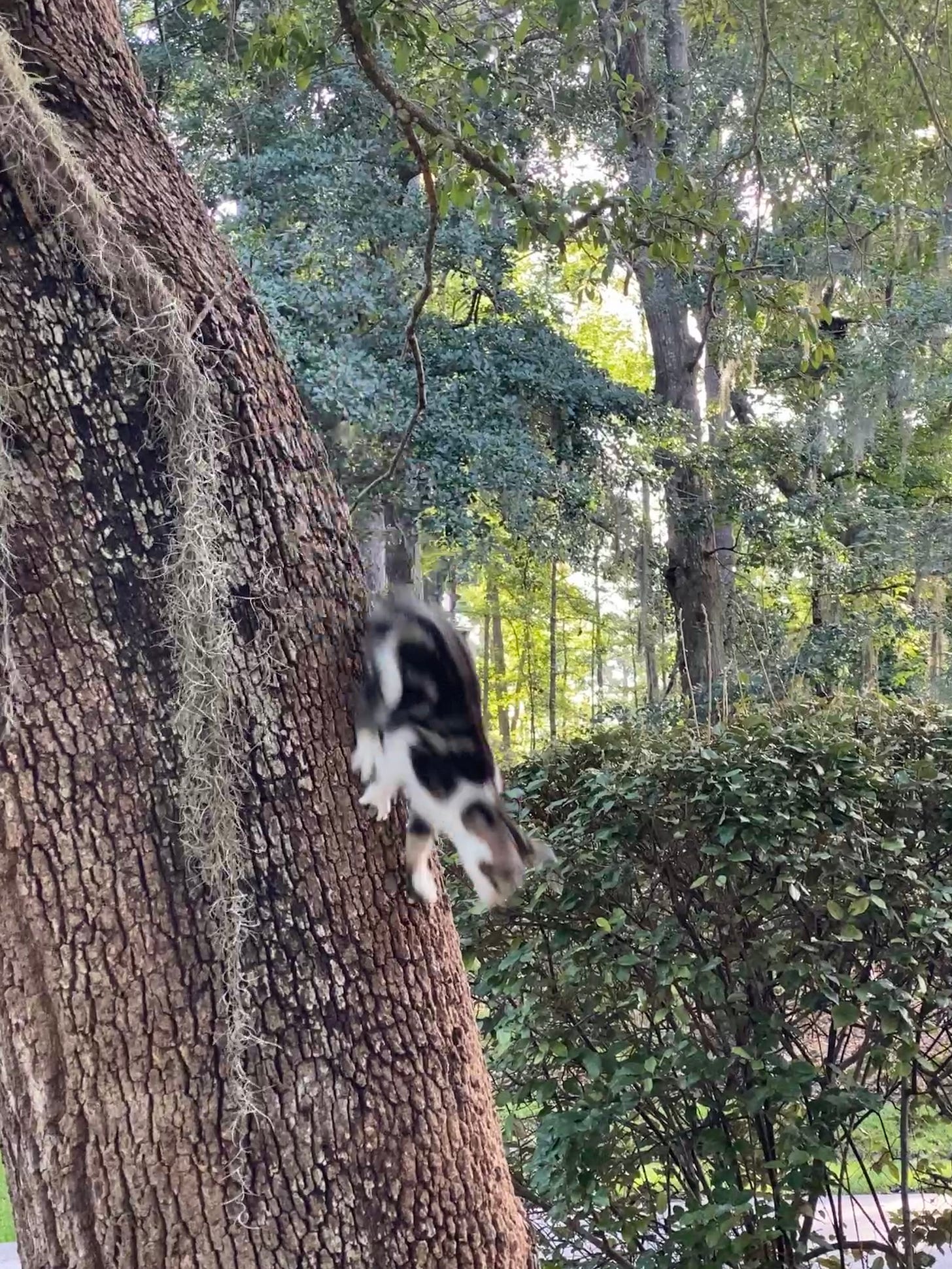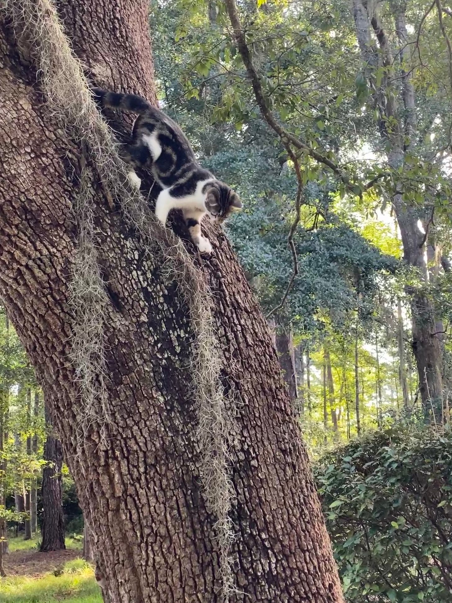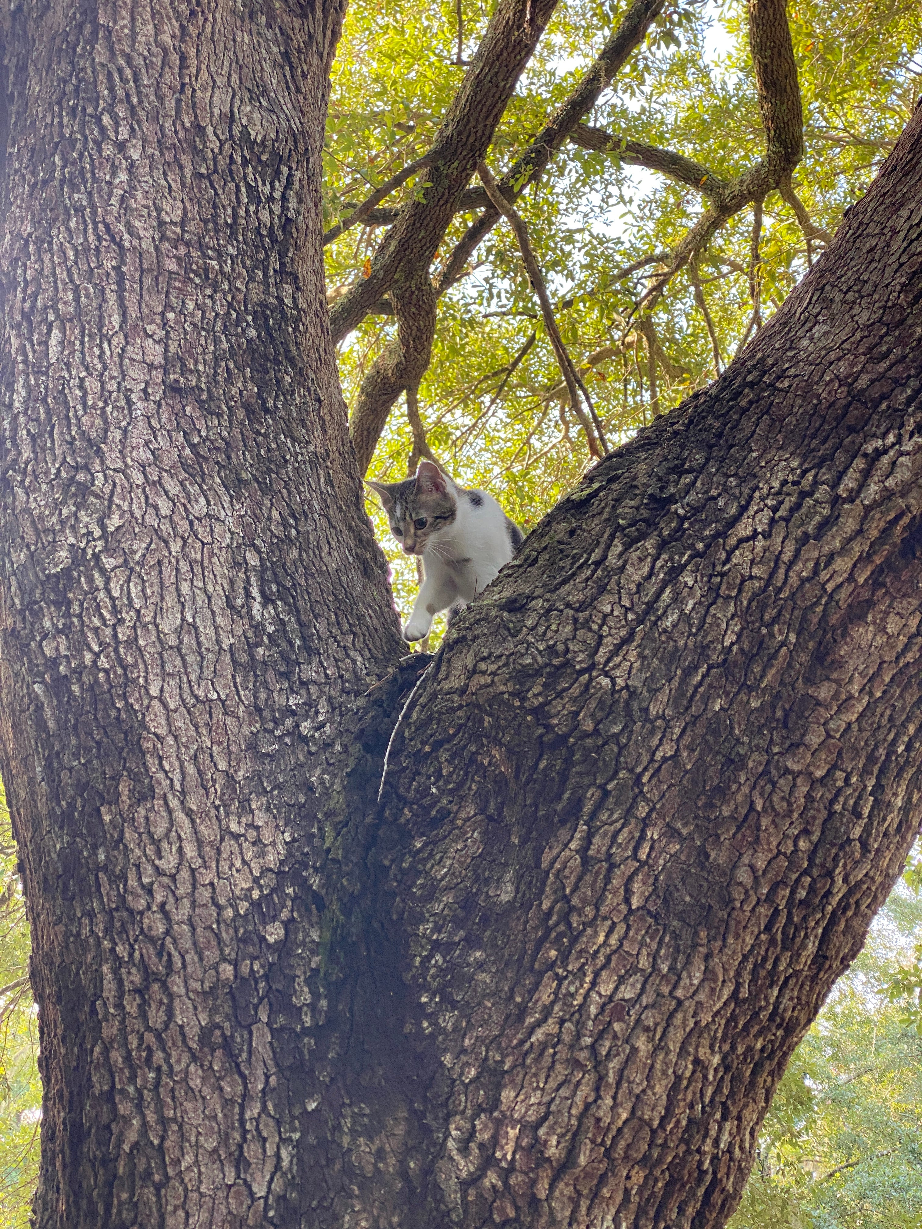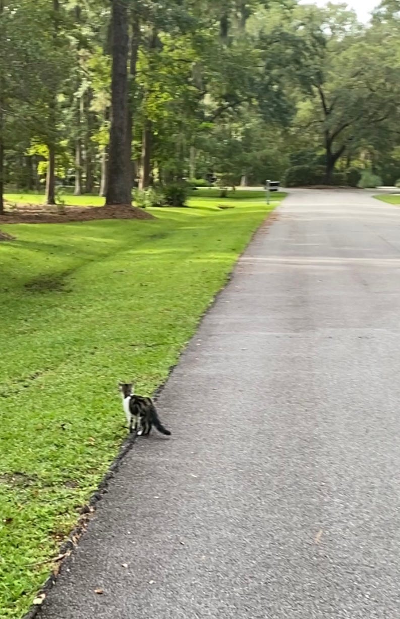 But there, at the quarter mile mark, looming in the center island at the heart of the cul-de-sac, is a magnificent live oak. It’s a perfect cat tree. The trunk has a nice V just right for perches and surveying one’s Queendom.